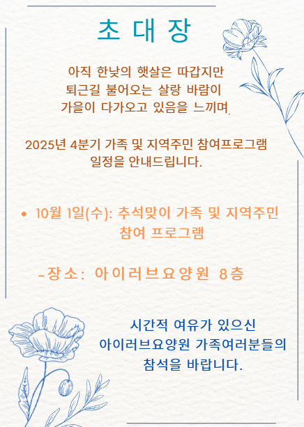 늦여름과 초가을 사이에 있는 9월~ 아직 한 낮의 햇살은 후덥지근하지만 퇴근 길에 불어오는 사랑 바람이 가을이 다가오고 있음을 실감케 하고 있습니다. 다가오는 10월, 2025년 4분기 가족 및 지역주민 참여 프로그램 일정을 안내드립니다. -10월 1일(수): 추석맞이 가족 및 지역주민 참여프로그램 -장소: 아이러브요양원 8층 |