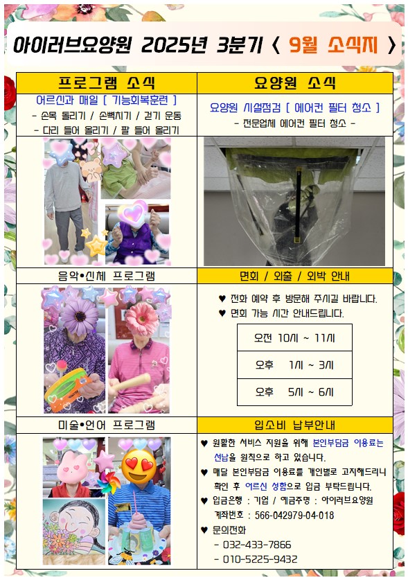 안녕하세요. 2025년 3분기를 마치며 9월 소식을 안내드립니다. 항상 어르신을 최우선으로 하는 아이러브요양원이 되도록 노력하겠습니다. 아이러브 가족여러분 모두 건강하시고 풍성한 한가위를 맞이하실 바랍니다. |