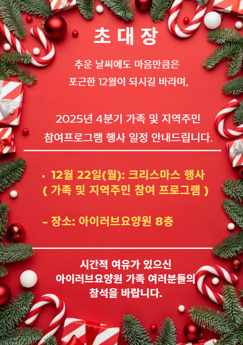 추운 날씨에도 마음만큼은 포근한 12월이 되시길 바라며, 2025년 4분기 가족 및 지역주민참여프로그램 행사 일정 안내드립니다. -12월 22일(월): 크리스마스 행사 ( 가족 및 지역주민참여프로그램) -장소: 아이러브요양원 8층 |