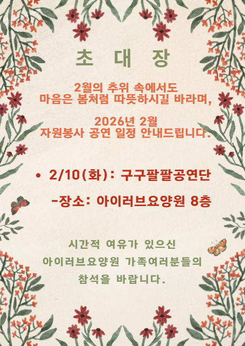 2월의 추위 속에서도 마음은 봄처럼 따뜻하시길 바라며, 2026년 2월 자원봉사 공연 일정 안내드립니다. |