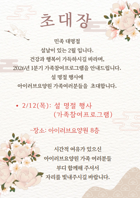 민족 대명절 설날이 있는 2월 입니다. 건강과 행복이 가득하시길 바라며, 2026년 1분기 가족참여프로그램을 안내드립니다. 설 명절 행사에 아이러브요양원 가족여러분들을 초대합니다. |