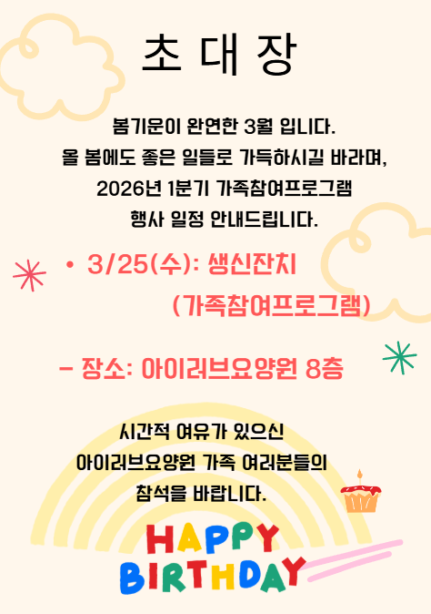 봄기운이 완연한 3월 입니다. 올 봄에도 좋은 일들로 가득하시길 바라며, 2026년 1분기 가족참여프로그램 행사 일정 안내드립니다. ● 3/25(수): 생신잔치 (가족참여프로그램) - 장소: 아이러브요양원 8층 시간적 여유가 있으신 아이러브요양원 가족 여러분들의 참석을 바랍니다. |