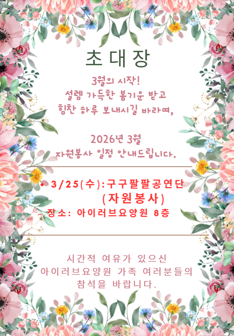 3월의 시작! 설렘 가득한 봄기운 받으시고 힘찬 하루 보내시길 바라며, 2026년 3월 구구팔팔공연단 자원봉사 일정 안내드립니다. ● 3/25(수): 구구팔팔공연단 (자원봉사) - 장소: 아이러브요양원 8층 시간적 여유가 있으신 아이러브요야야원 가족 여러분들의 참석을 바랍니다. |