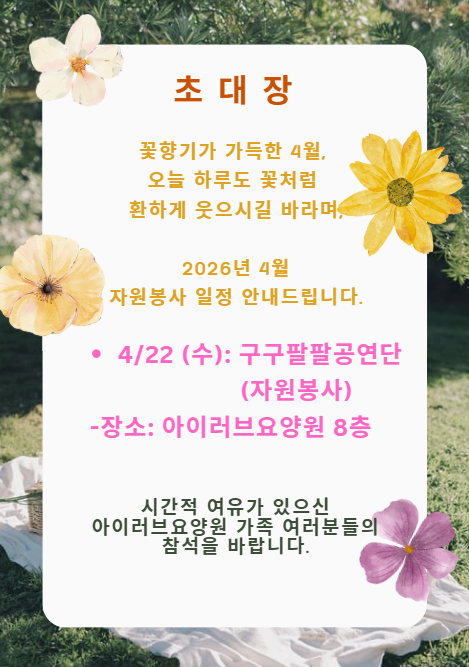 꽃향기가 가득한 4월, 오늘 하루도 꽃처럼 환하게 웃으시길 바라며~ 2026년 4월 자원봉사 일정 안내드립니다. ● 4/22 (수): 구구팔팔공연단 (자원봉사) - 장소: 아이러브요양원 8층 시간적 여유가 있으신 아이러브요양원 가족 여러분들의 참석을 바랍니다. |